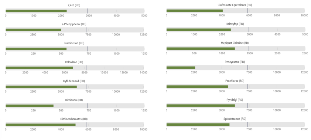 La stessa selezione di prodotti è campionata ogni tre anni, così da individuare le tendenze. Il tasso complessivo di residui di pesticidi che superano l’LMR è passato dall’1,4% nel 2018 al 2,1% nel 2021. Escludendo i pompelmi, il tasso medio di superamento degli LMR è stato dell’1,4% nel 2021, lo stesso del 2018.